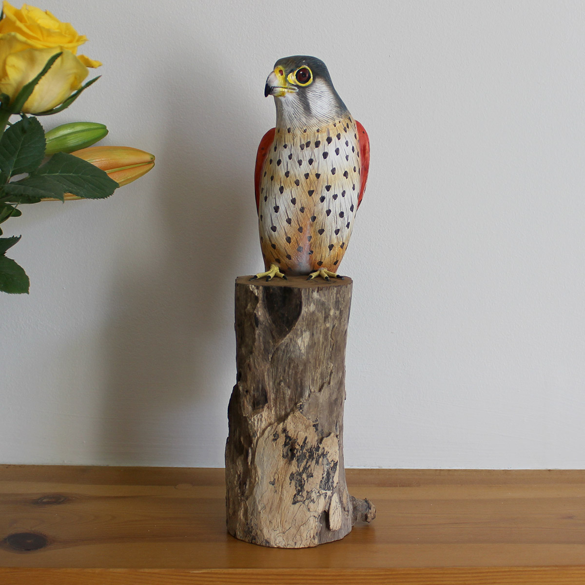 This kestrel stands around 20cm tall. The driftwood stands vary in height from piece to piece.